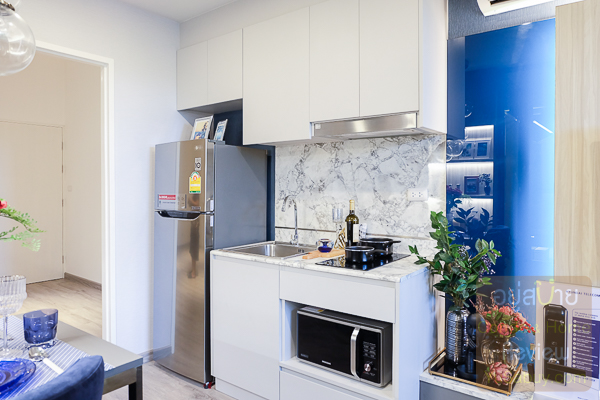 เปิดห้องเข้าไปจะพบกับพื้นที่โซนครัว ที่ทำเคาน์เตอร์ Built-in มาให้และพื้นที่รับประทานอาหารที่สามารถวางโต๊ะขนาดเล็กได้ ฝ้าเพดานสูง 2.6 เมตร ทำให้ห้องดูโปร่ง ไม่อึดอัด
