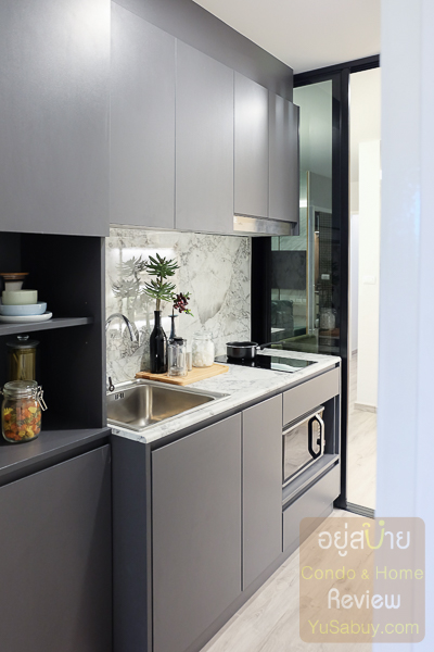 โซนครัวมีการ Built-in เคาน์เตอร์ครัวและตู้เก็บของมาให้ โดยคุมโทนสีเป็นสีเทาเข้ม